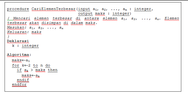 Persoalan: Diberikan sebuah himpunan yang beranggotakan n buah bilangan bulat. Bilangan-bilangan bulat tersebut dinyatakan sebagai a1, a2, …, an. Carilah elemen terbesar di dalam himpunan tersebut.