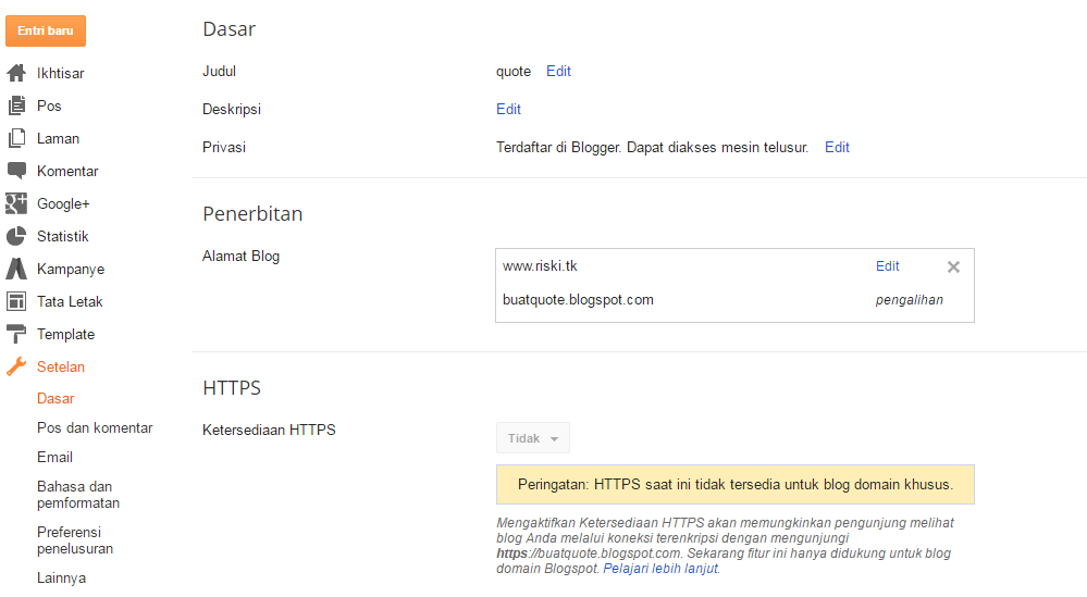 buka setelan – dasar – pada alamat blog kemudian hapus domain TLD nya dengan menekan tombol X
