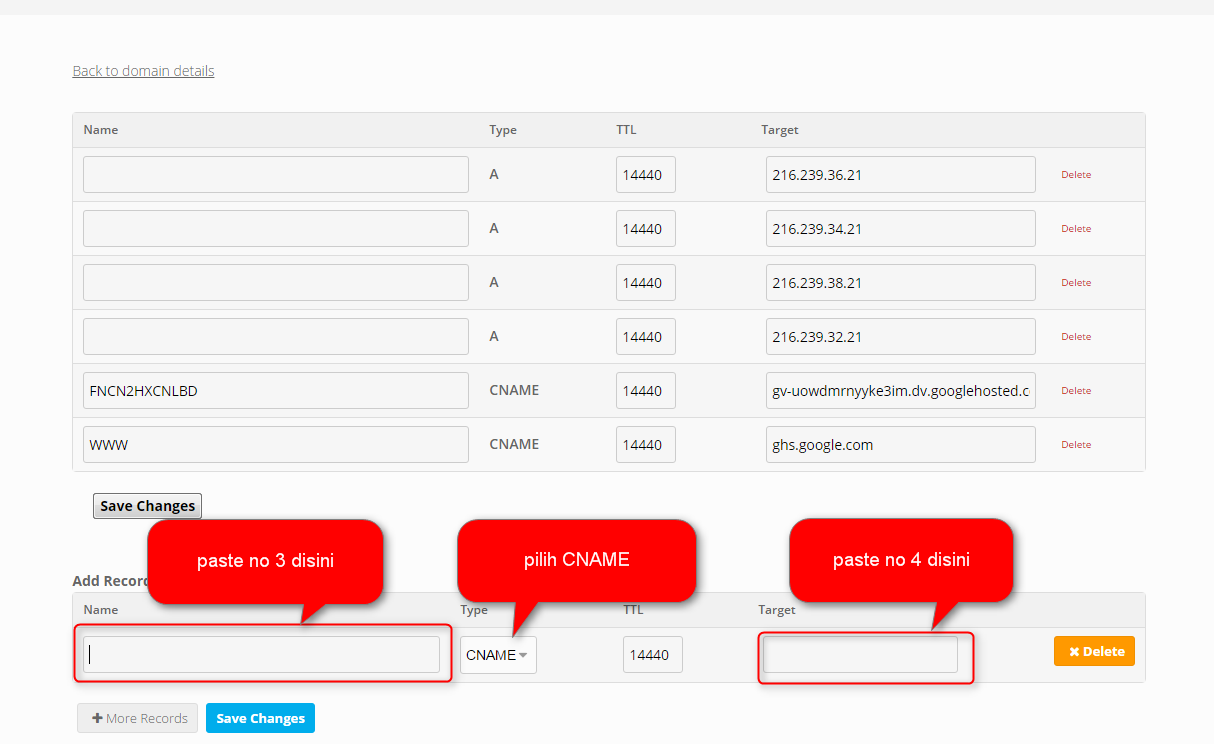4. kemudian tambahkan record baru dns yang saya suruh anda catat pada langkah 1 tadi pada kolom seperti gambar dibawah ini