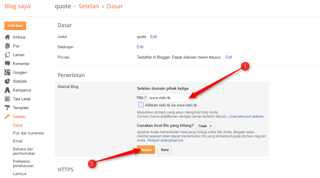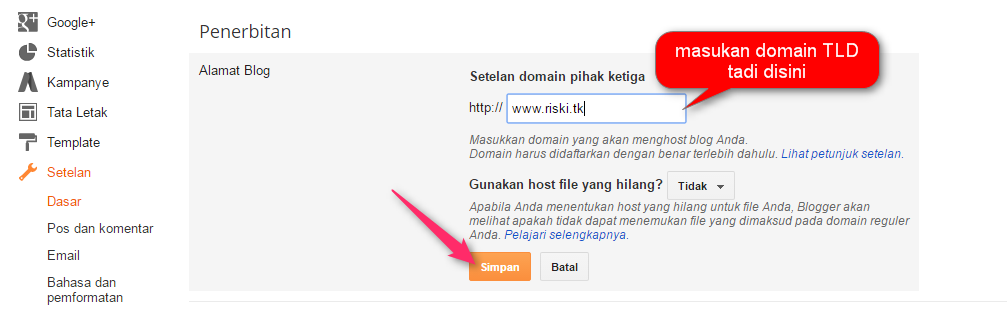 5. kembali lagi masuk kesetelah blogger, masukan ulang domain kemudian klik simpan, jika belum bisa silahkan tunggu proses pengalihan dns berlangsung biasanya lamanya hanya beberapa menit paling lama 30 menit