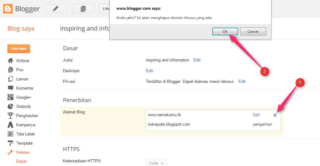 ketika muncul peringatan tekan ok maka secara otomatis domain TLD anda terputus dari blog tersebut dan alamat blog anda kembali kealamat bawaan blogspot seperti semula.