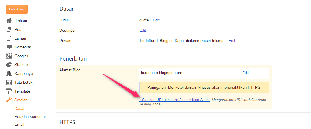 1. buka setelan – dasar – pada alamat blog kemudian klik +siapkan url pihak ke3 untuk blog anda