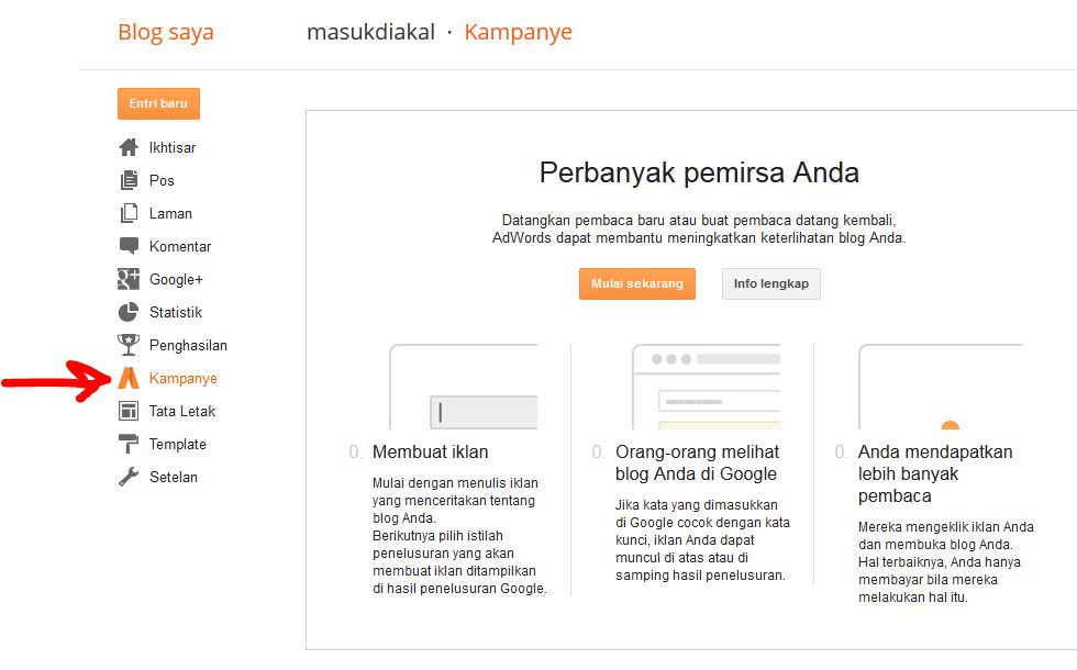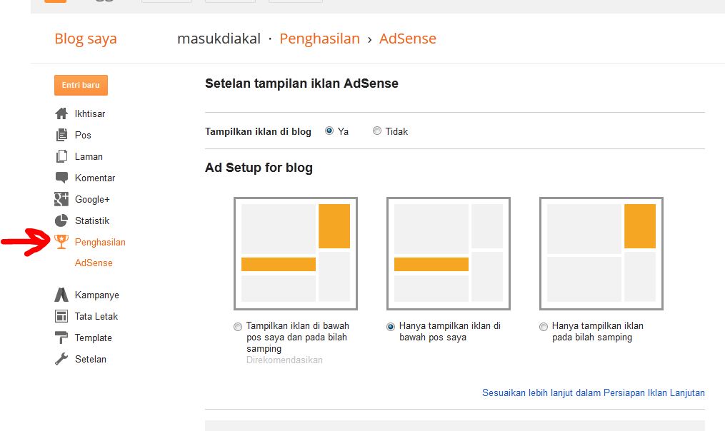 penghasilan : yaitu google adsense biasanya akan muncul jika blog anda sudah lebih dari 6 bulan, dan memiliki pengunjung yang cukup.