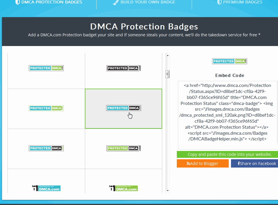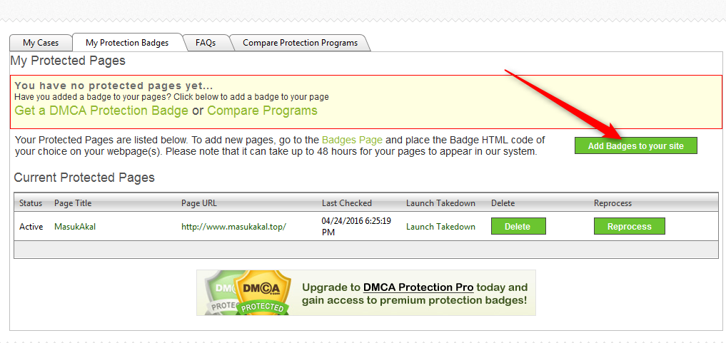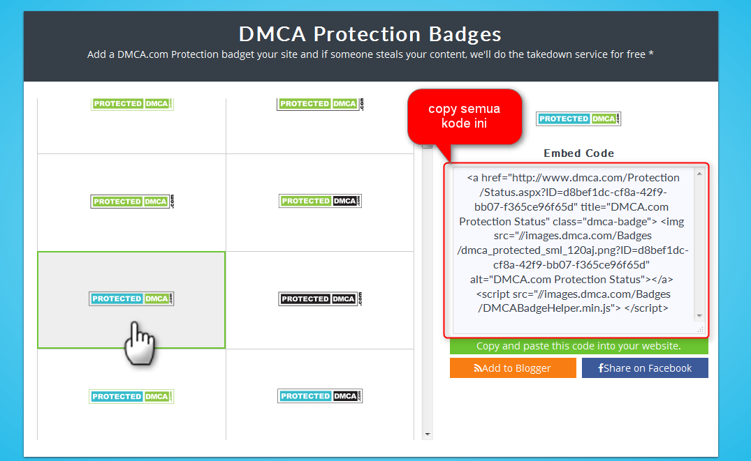 6. klik tombol add bandes to your site untuk memasang kode dmca ke situs anda