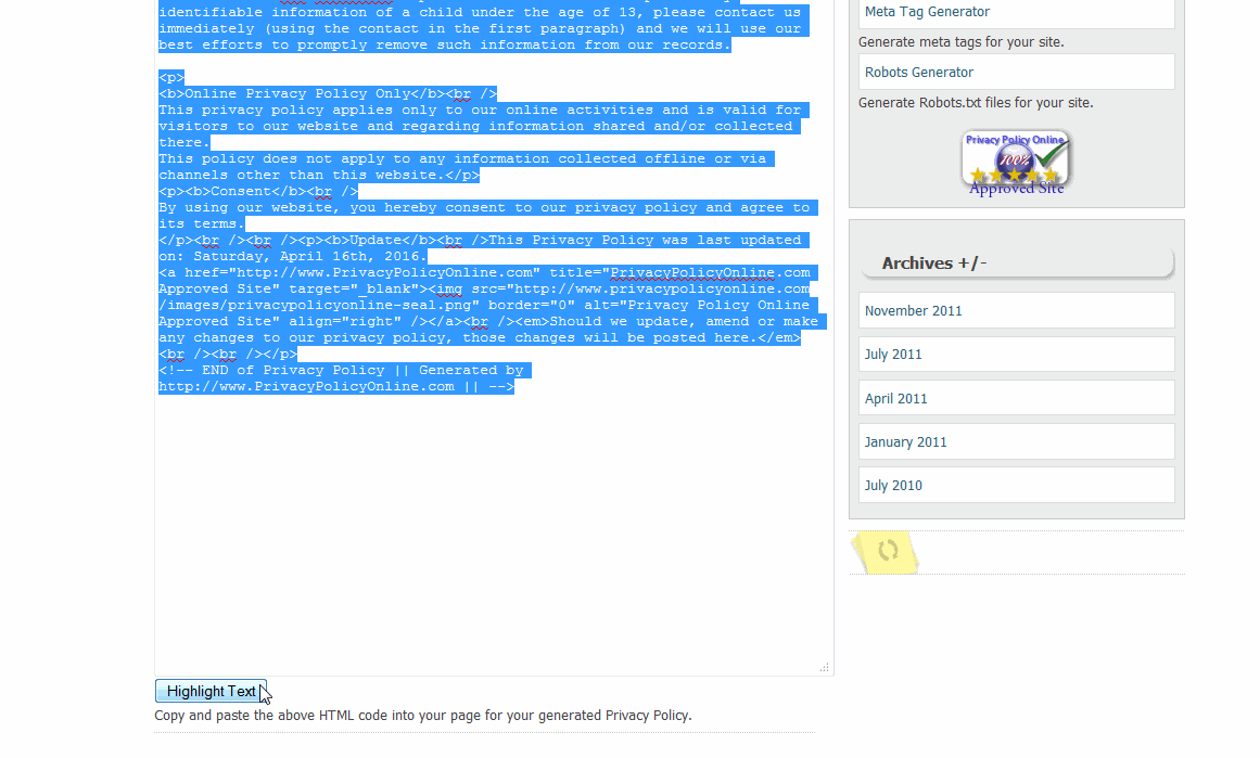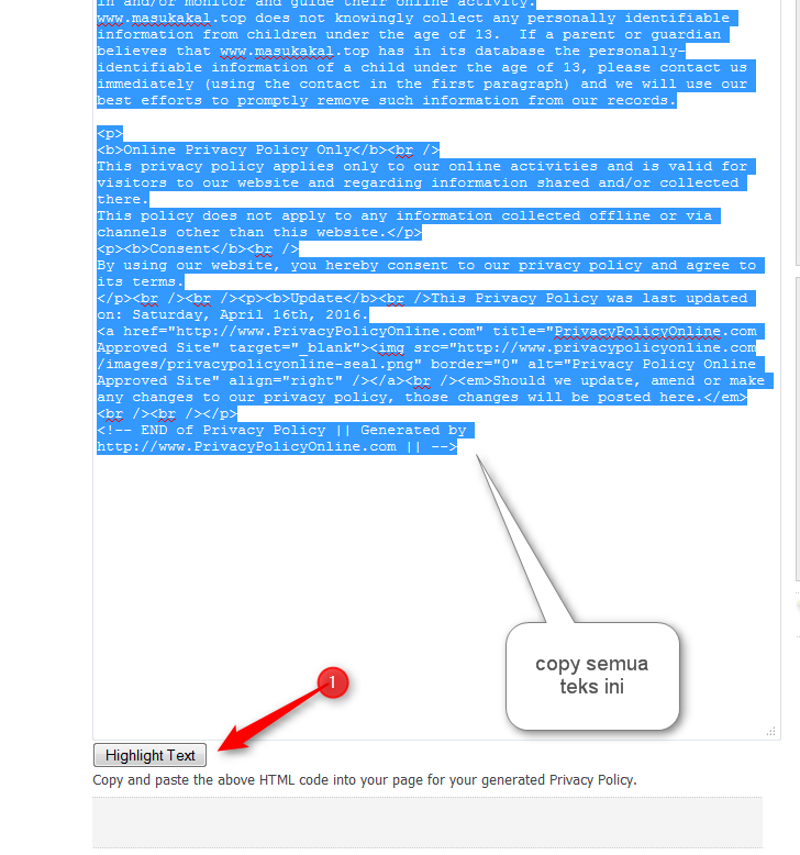 6. setelah tulisan privacy policy nya berubah menjadi html teks selanjutnya anda tombol tekan highlight teks maka semua tulisan privacvy policy nya otomatis semua terblok, tinggal anda copy seluruh tulisan itu