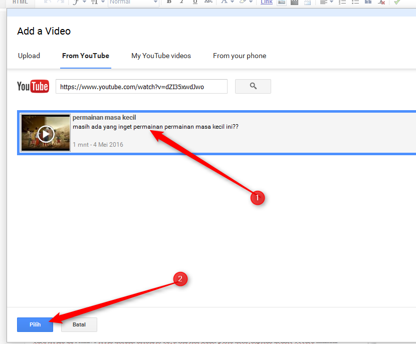 6. setelah muncul video, klik video tersebut dan klik pilih