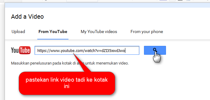 5. pilih from youtube dan pastekan link video anda, kemudian klik icon seacrh