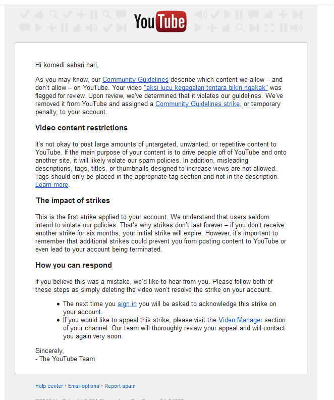 setelah membaca sebuah postingan tentang cara mendapat uang dari youtube tanpa upload video dan hanya dengan mengedit video yang berhak cipta CC(cumon creatif), tiba tiba sekitar seminggu yang lalu saya mendapatkan sebuah email dari youtube yang berisi bahwa chanel youtube saya terkena strike 1 dan diberi masa peringatan selama 6 bulan.