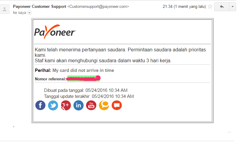 8. terakhir Tunggu balasan dari Payoneer, jika sudah mendapatkan balasan ikuti petunjuk untuk pengiriman Matercard yang kedua. seperti di bawah ini balasan dari payoneer