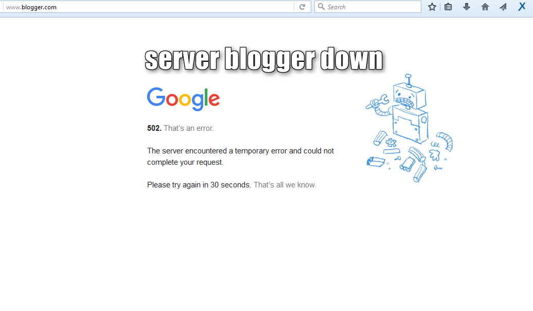 sekedar ingin berbagi informasi, baru saja untuk pertama kali nya server blogger mengalami down, hal yang jarang sekali terjadi dan dialami oleh blogger.