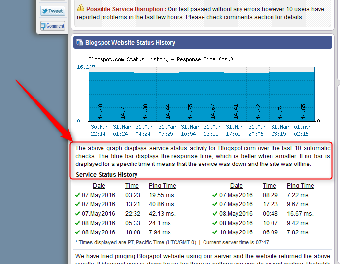 The above graph displays service status activity for Blogspot.com over the last 10 automatic checks. The blue bar displays the response time, which is better when smaller. If no bar is displayed for a specific time it means that the service was down and the site was offline.