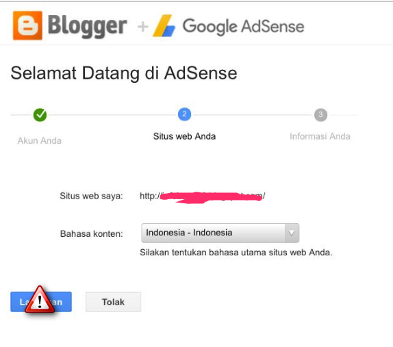 dan jika anda tetap mencoba mendaftarkan blog anda maka seperti kasus yang saya jelaskan diatas tombol lanjutkan tidak bisa ditekan saat daftar adsense.